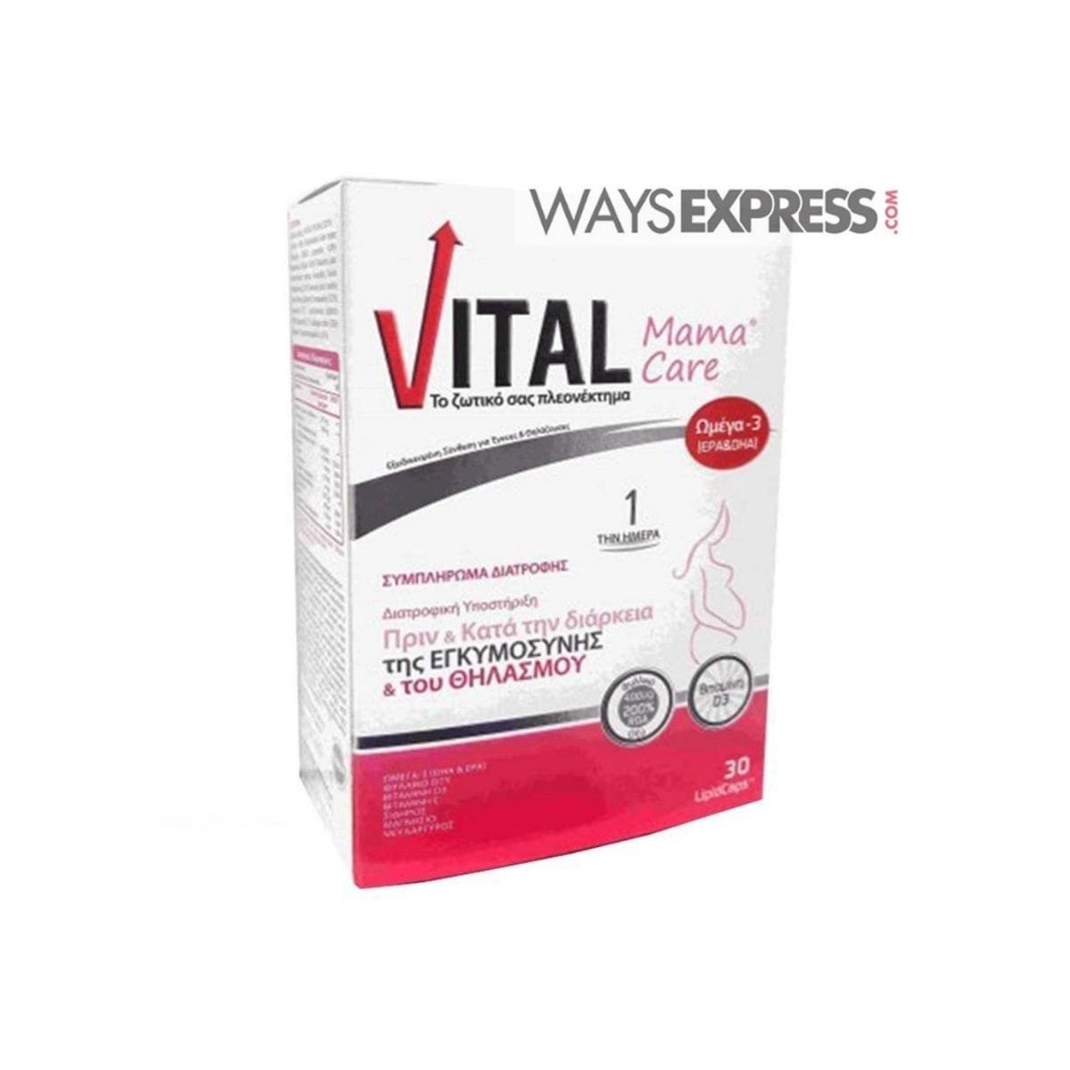 Η φόρμουλα VITAL Mama Care περιέχει Ωμέγα-3, Μαγνήσιο, Ψευδάργυρο, Βιταμίνη Ε, Φολικό Οξύ, Λοδίνη & Βιταμίνη D3 που δρουν συνεργικά